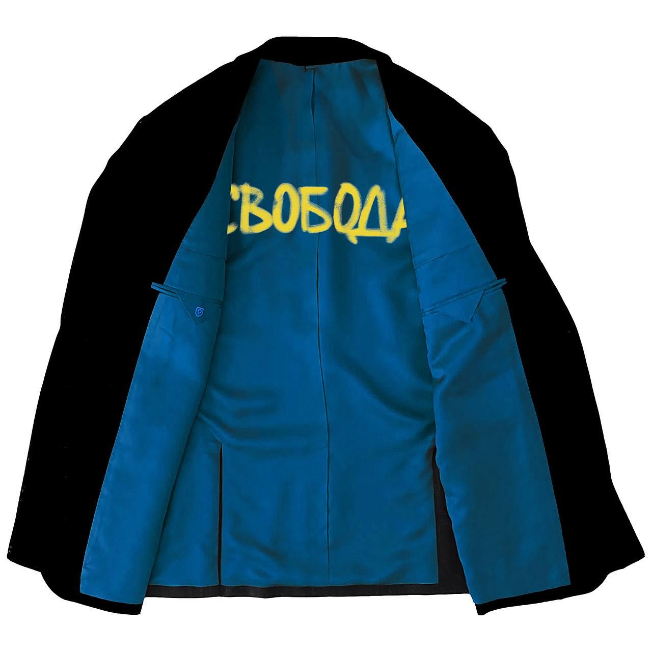 Сама річ, як можна побачити на опублікованому фото, виконана в чорному кольорі, у той час як підкладка зроблена з синього, а слово "Свобода" – нанесене жовтим. У коментарях люди зауважили, що така деталь має важливе значення і є дуже символічною. Ось, що пишуть юзери з цього приводу: