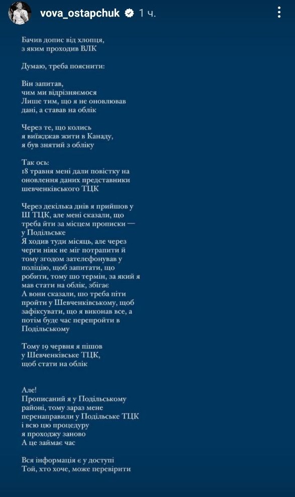 "Бачив публікацію хлопця, з яким проходив ВВК. Думаю, що треба прояснити. Він запитав, чим ми відрізняємося. Тільки тим, що я не оновлював дані, а ставав на облік. Через те, що я виїжджав жити до Канади, я був знятий з обліку", - зазначив шоумен.