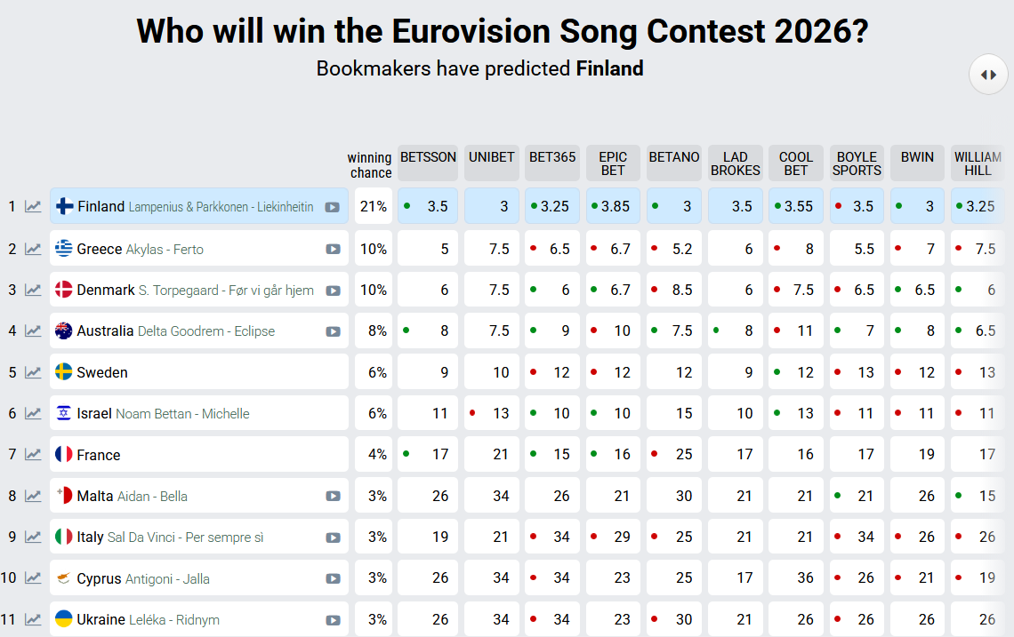 Фаворитами букмекерів є представники Фінляндії - скрипалька Лінда Лампеніус та співак Піт Паркконен з композицією Liekinheitin. Дуету прогнозують найвищі шанси на перемогу - 21%.
