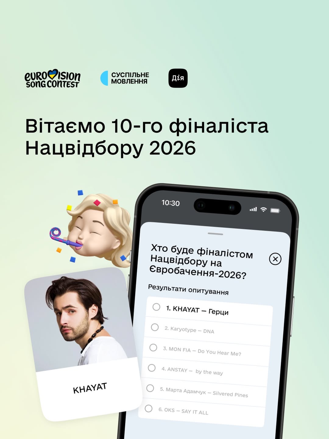 У "Дії" завершилося голосування за останнього фіналіста Національного відбору на "Євробачення-2026". Десятим учасником фіналу став співак KHAYAT - він набрав найбільшу кількість голосів від українців та отримав шанс позмагатися за право представити Україну на конкурсі у Відні (Австрія).