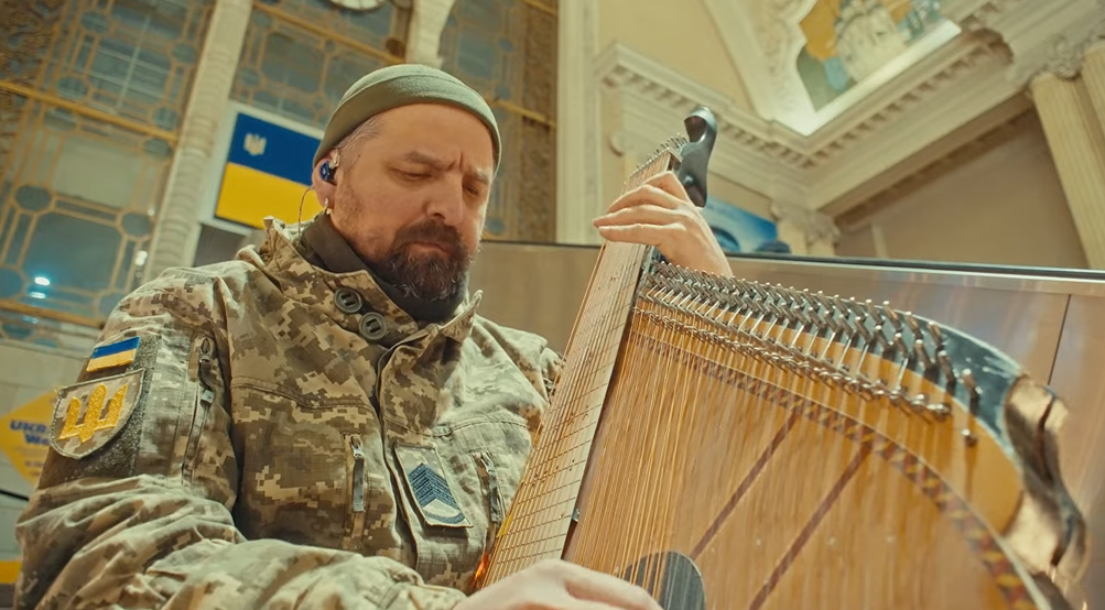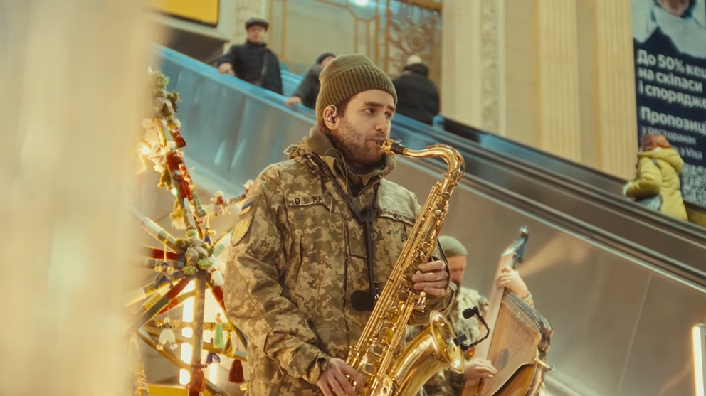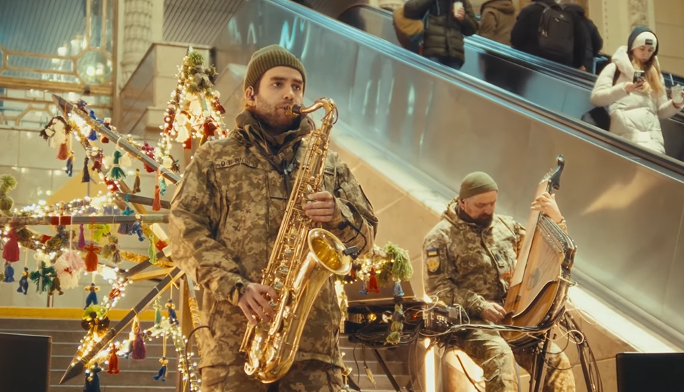 Нова інтерпретація відомої святкової пісні пролунала на залізничному вокзалі у Києві. Її виконали старший сержант Іван Ткаленко - ветеран війни та бандурист, а також солдат Андрій Мартиненко "Andrii Barmalii" - саксофоніст і композитор, який створює музику під впливом джанглу, джазу, року та хіп-хопу.