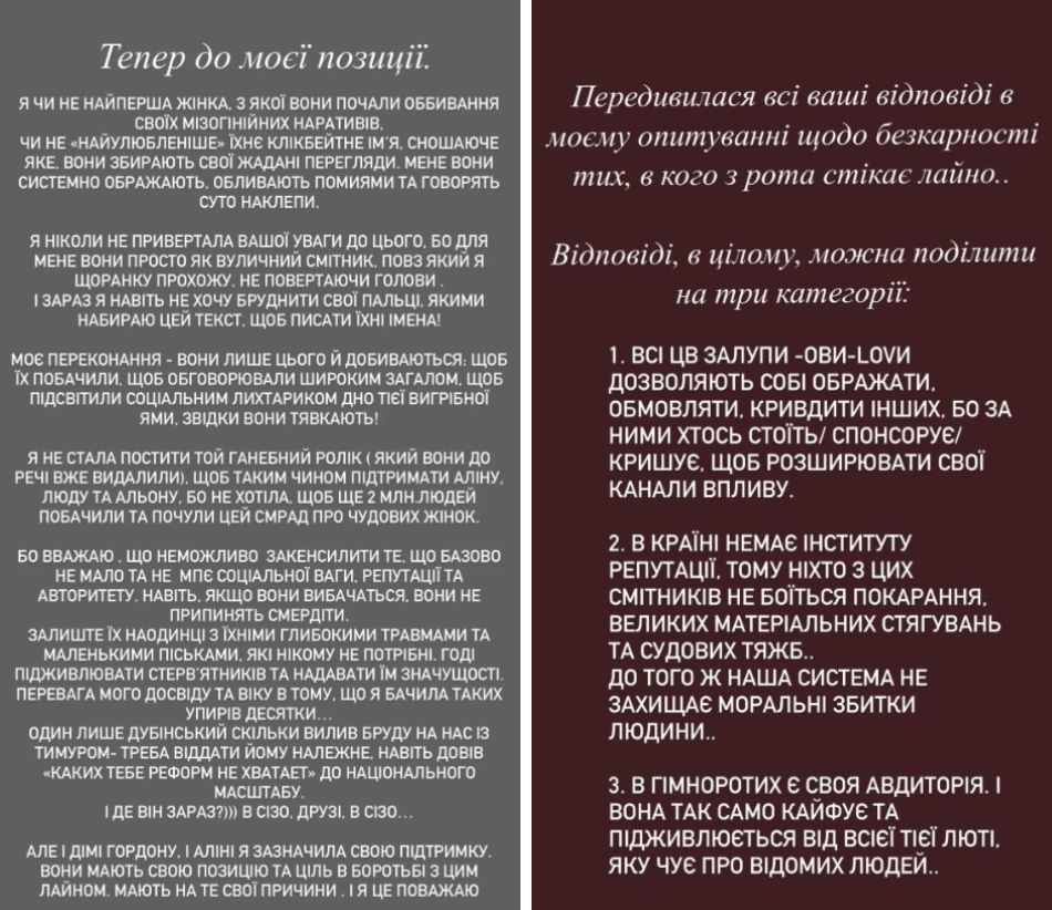 "Я чи не перша жінка, з якої вони почали оббивання своїх мізогінних наративів. Чи не "найулюбленіше" їхнє клікабельне ім'я, сношаючи яке вони збирають свої жадані перегляди. Мене вони системно ображають, обливають помиями та говорять суто наклепи", - пише вона.