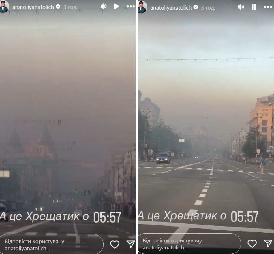 "Погляньте, скільки диму. Дихати немає чим. Ось так виглядає центр - Хрещатик, Бессарабка - просто все в диму. Дуже задимлено, дуже. Просто жесть", - поділився Анатолій Анатоліч.