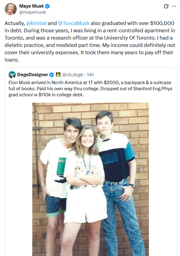 Так, вона відреагувала на допис у мережі про те, що Ілон Маск прибув до Північної Америки у 17 років з 2 тис. доларів, рюкзаком та валізою, повною книг. Самостійно оплачував навчання в коледжі, а потім покинув аспірантуру з інженерії/фізики Стенфордського університету із заборгованістю перед коледжем у 110 тис. доларів.