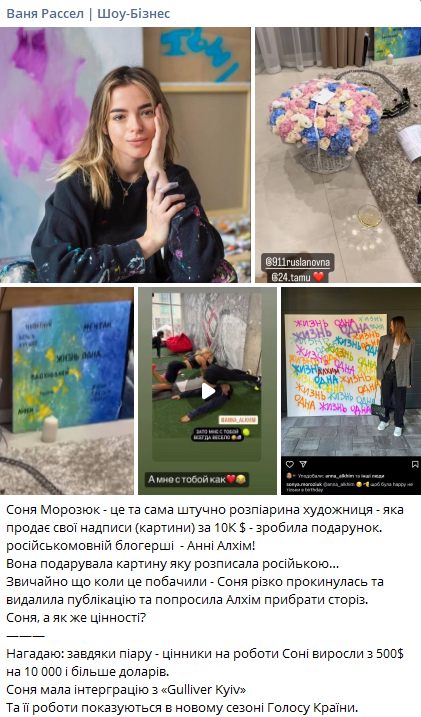 Сама Соня ситуацію ніяк не коментує. Морозюк закрила свої сторінки в Instagram: особистий профіль та робочий аккаунт зі своїми картинами.