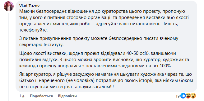 "Як арт куратор, я рішуче засуджую намагання цькувати художника через те, що батько її нареченого (не чоловіка) потрапив до якоїсь історії, яка ніяким боком не стосується мистецтва та науки загалом!", - написав у коментарях Влад Тузов.