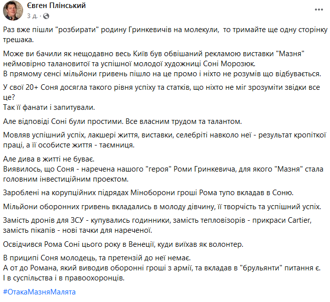 "Зароблені на корупційних підрядах Міноборони гроші Рома тупо вкладав у Соню. Мільйони оборонних гривень вкладалися в молоду дівчину, її творчість та успішний успіх. Замість дронів для ЗСУ – купувався годинник, замість тепловізорів – прикраси Cartier, замість пікапів – нові тачки для нареченої. Освідчився Рома Соні у Венеції, куди поїхав як волонтер. В принципі Соня молодець, претензій до неї немає. А от до Романа, який виводив оборонні гроші з армії, і вкладав у "брульянти" питання є. І у суспільства і правоохоронців", - написав він у Facebook.