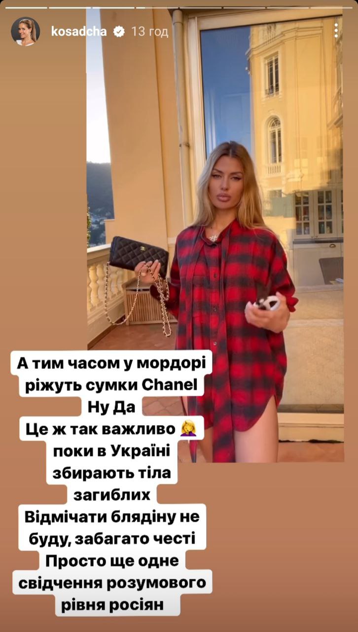 Телеведуча опублікувала у своїх Instagram-історіях коротке відео, на якому російська модель і блогер на камеру розрізає дорогу стьобану сумку, а перед цим каже: "Якщо дім Chanel не поважає своїх клієнтів, чому ми маємо поважати дім Chanel?".