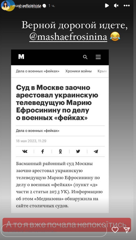 За даними російського видання "Медіазона", Єфросиніну заочно заарештував суд Москви. Українку звинувачують у поширенні "військових фейків". На новину звернув увагу експерт шоу "Топ-модель по-українськи" Сергій Нікітюк та опублікував у себе в "сторіз" скріншот статті. "Вірною дорогою йдете, Маша Єфросиніна", - посміявся він.