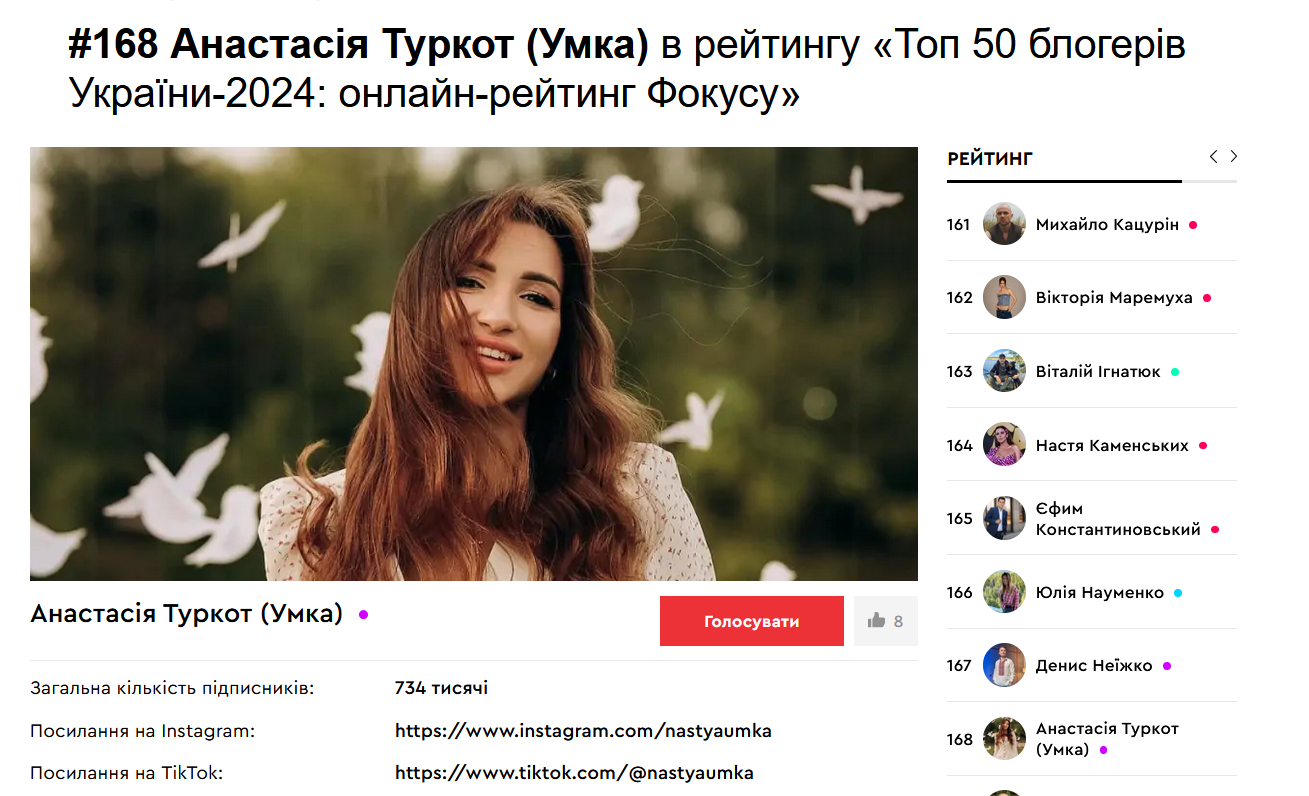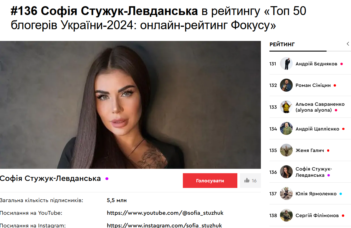 Видання "ФОКУС" відкрило голосування на рейтинг "Топ-50 блогерів України-2024". Серед номінантів - один з найпопулярніших волонтерів України Сергій Притула, захисник Віктор Розовий, який отримав важке поранення на фронті, а також Софія Стужук, Корячка (Тетяна Коряк), Анна Алхім, з іменами яких пов'язано чимало скандалів.