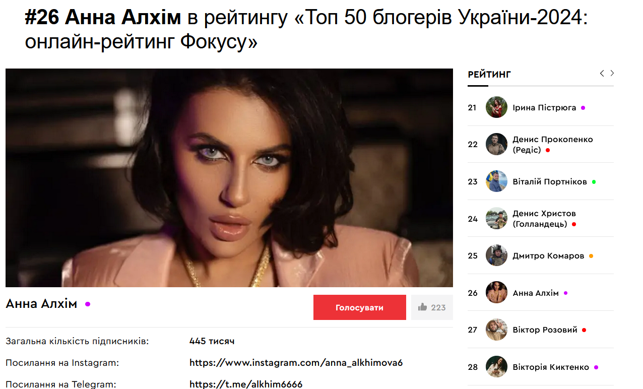 Також серед претендентів на топ-50 найкращих українських блогерів - Анастасія Туркот (Умка), яку внесли до бази "Миротворець" за поширення російської пропаганди і Анна Алхім, яка відома своїми скандальними витівками та заявами. Прихильниця російської мови і музики називала "нацизмом" заклики переходити на українську, а також вихваляла "впливового чоловіка" та "красеня" Путіна.