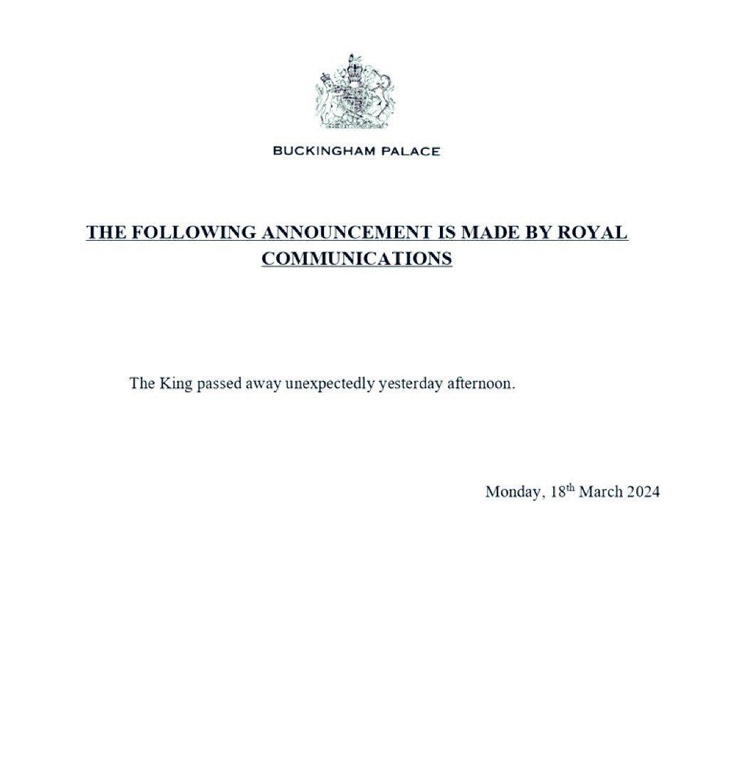 Фейк про смерть короля Чарльза спершу з'явився у російських ЗМІ із "посиланням" на Букінгемський палац. В якості "підтвердження" вони опублікували зображення з гербом палацу та написом: "Наступне оголошення зроблено королівськими представниками. Король несподівано помер учора вдень. Понеділок, 18 березня 2024 року".