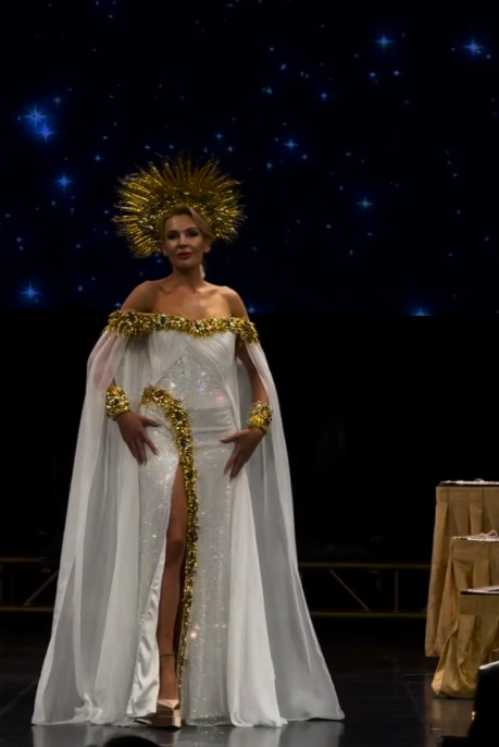 На "Місіс Світу-2023" представниця України виступила з важливим месенджем: миру усьому світу. Національний костюм українки був натхненний образом Богині Миру Ейрени та золотими колоссями української землі.