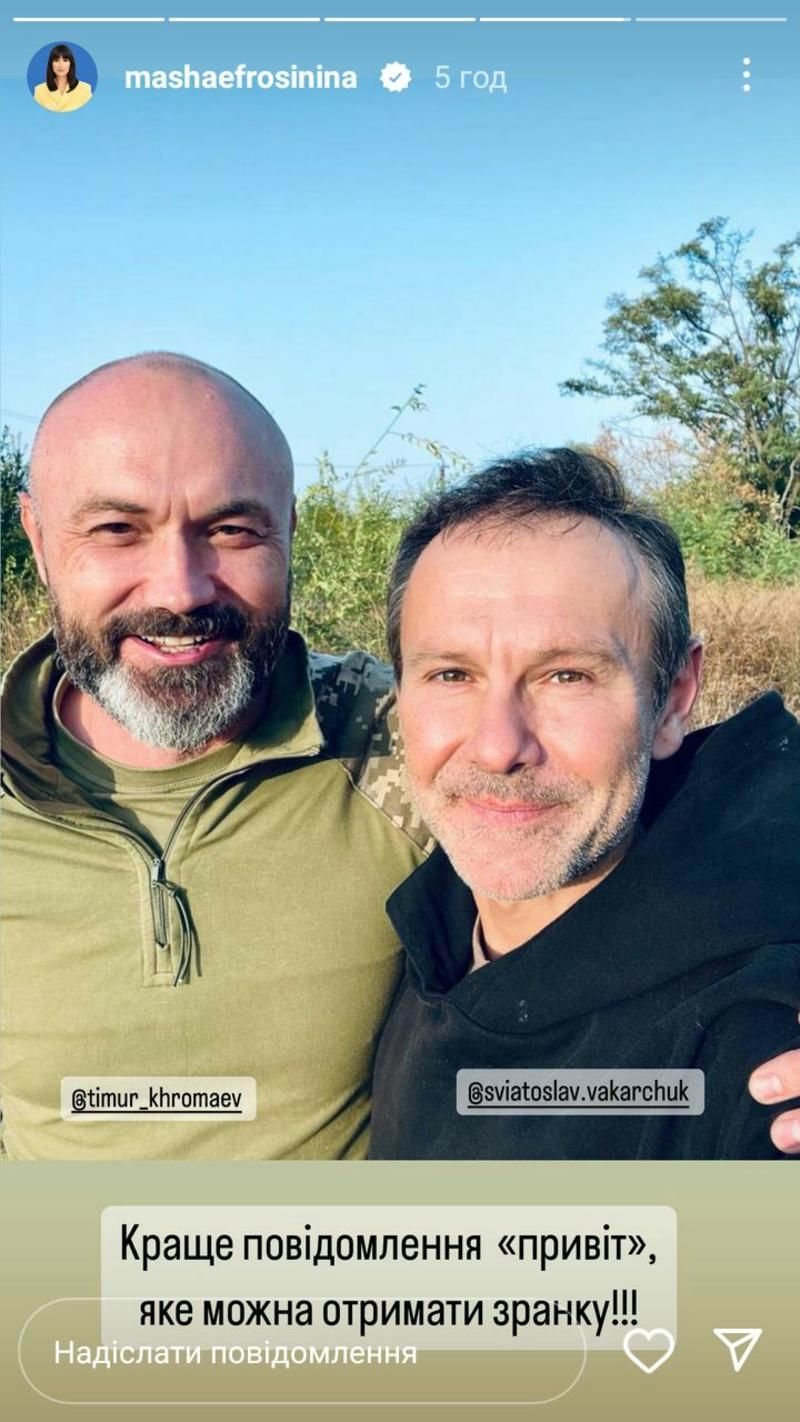 Тимур Хромаєв, чоловік української телеведучої Маші Єфросініної, боронить нашу країну у лавах ЗСУ, і нещодавно він зустрівся із фронтменом гурту "Океан Ельзи" Святославом Вакарчуком. Їхня спільна фотографія вже з'явилася у соцмережах.