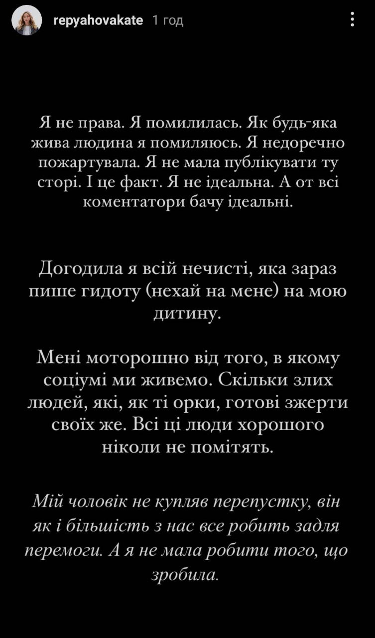 "Я не права. Я помилилася. Як будь-яка жива людина я помиляюся. Я недоречно пожартувала. Я не повинна була публікувати ту сторі. І це факт. Я не ідеальна. А ось усі коментатори, бачу, ідеальні, - поскаржилася вона на критиків. - Мій чоловік не купував перепустки, він, як і більшість із наших, все робить заради перемоги. А я не повинна була робити те, що зробила".