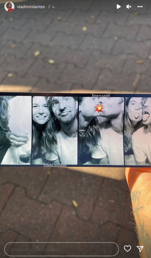 Нещодавно Дантес і Кацуріна разом вирушили до Тель-Авіва, а тепер артист показав неоднозначне фото. Володимир опублікував у "сторіз" слайд-шоу із спільних фотографій з Дашею, серед яких є кадр поцілунку. На ньому Дантес і акцентував увагу підписників, заблюривши "вогнем" та підписавши "братський".