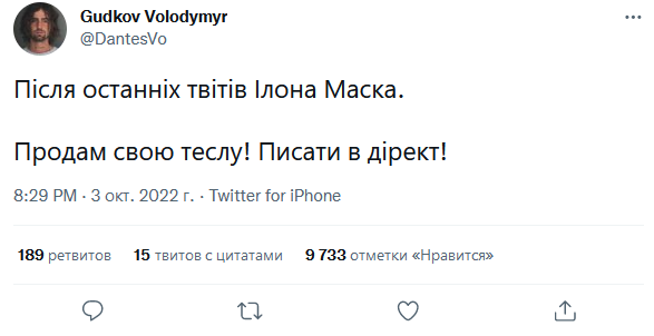 "Після останніх твітів Ілона Маска. Продам свою теслу! Писати в дірект!", - написав український музикант на сторінці у Twitter.