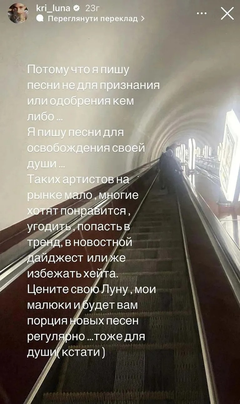 У Instagram Луна опублікувала stories, в яких заборону російськомовної музики назвала "надуманою". Вона збирається створювати та виконувати пісні російською, бо "не може відчути" українську.