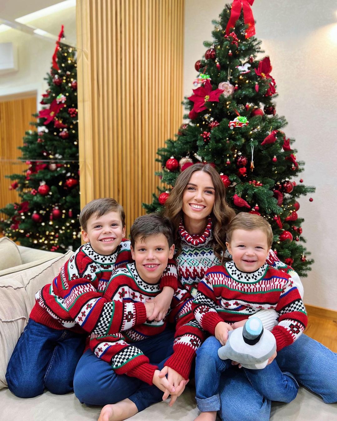 "На вихідні ми прикрасили ялинку і нарешті зробили біля неї фото. Хлопчики були в чудовому настрої, від нашої красуні не відходили ні на секунду. Сашуня навчився говорити слово "лялинка". Як же діти хочуть свята, і нікому не вдасться його у нас забрати", - написала Христина Решетнік.