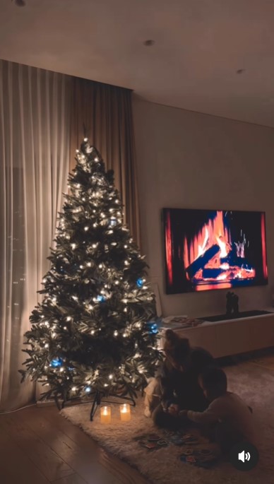 Даша Квіткова та Микита Добринін також поставили ялинку, прикрасивши її білими та блакитними гірляндами. Поруч із нею на м'якому затишному килимі парі тепло та затишно гратися зі своїм сином Левом.