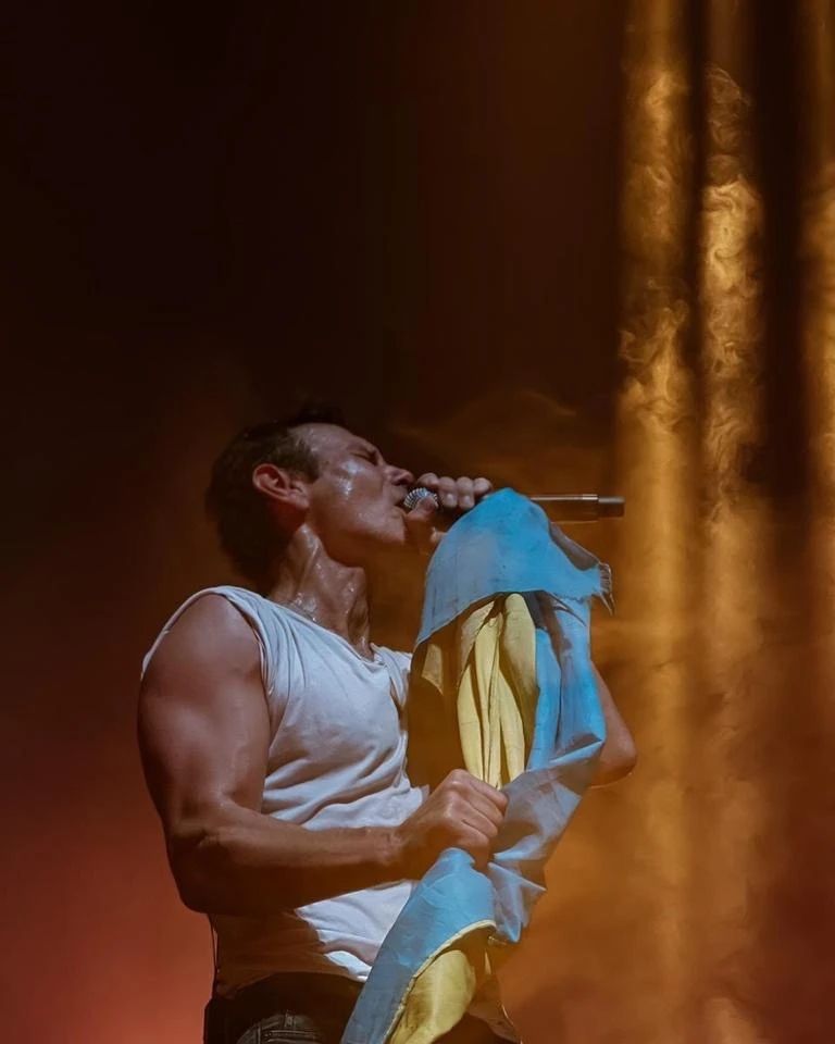 Лідер гурту "Океан Ельзи" опублікував в Instagram два знімки, зроблені на сцені. На одному з них він співає, тримаючи рукою стійку мікрофона з українським прапором. На фото чітко видно значних розмірів біцепс артиста.