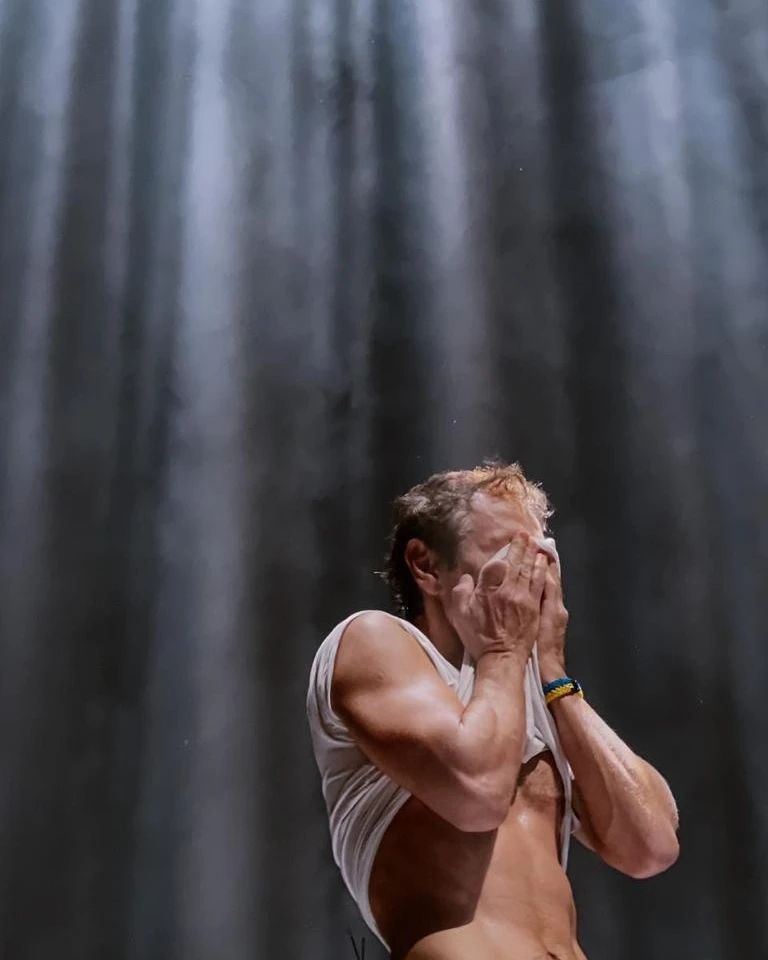 На другому знімку Вакарчук витирає обличчя майкою, оголивши бездоганний прес із кубиками. Виразно видно, що артист, який нещодавно став батьком удруге, не закинув спорт.