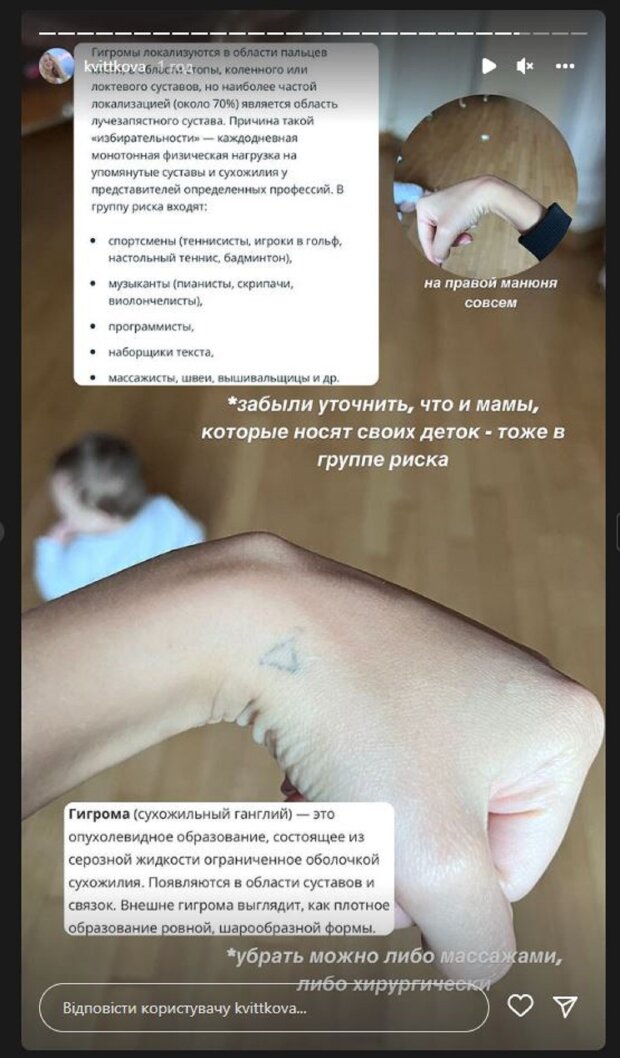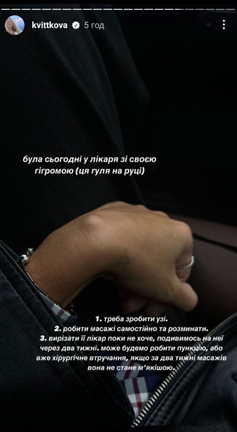 "Була сьогодні у лікаря зі своєю гігромою. 1. Потрібно зробити УЗІ. 2. Робити масажі самостійно та розминати. 3. Вирізати її лікар поки не хоче, подивимось на неї через два тижні. Може будемо робити пункцію або вже хірургічне втручання, якщо за два тижні масажів вона не стане м"якшою", - поділилася дівчина у своєму блозі в Instagram.