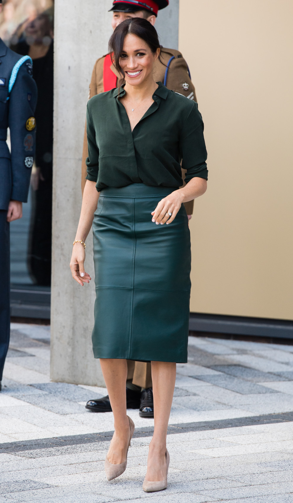 Зазначимо, що, крім дорогих брендових речей, в гардеробі дружини принца Гаррі є досить демократичні речі. Так, у 2018 році для поїздки в графство Сассекс Меган Маркл обрала темно-зелену блузку, спідницю зі шкіри в тон і бежеві туфлі-човники. Свій образ вона доповнила елегантним браслетом на руці та кулоном на шиї.
