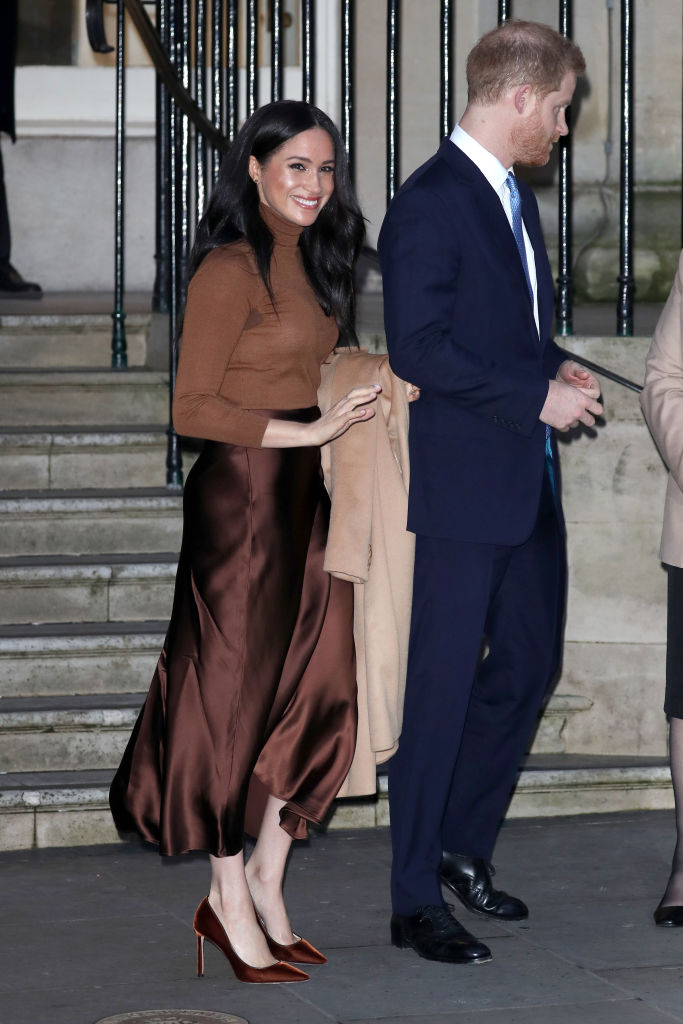 У січні 2020 року, коли Меган і Гаррі повернулися у Лондон після шестиденної канадської подорожі, герцогиня Сассекська відвідала громадську кухню Hubb Community Kitchen, щоб привітати співробітників з різдвяними святами. Для цього виходу вона обрала наряд у бежево-коричневій гамі: атласну спідницю-міді, водолазку, пальто пісочного кольору і туфлі-човники на високих підборах.