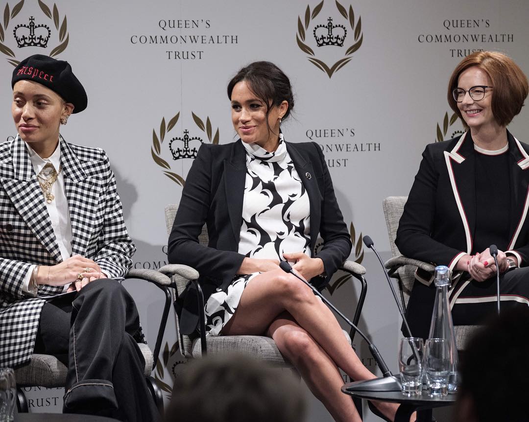 У 2019, будучи вагітною своїм первістком, герцогиня Сассекська брала участь у заходах, присвячених Міжнародному жіночому дню. Для виходу в світ вона обрала коротке чорно-біле міні-плаття з абстрактним візерунком. Доповнила образ чорним жакетом, елегантними туфлями-човниками і клатчем.