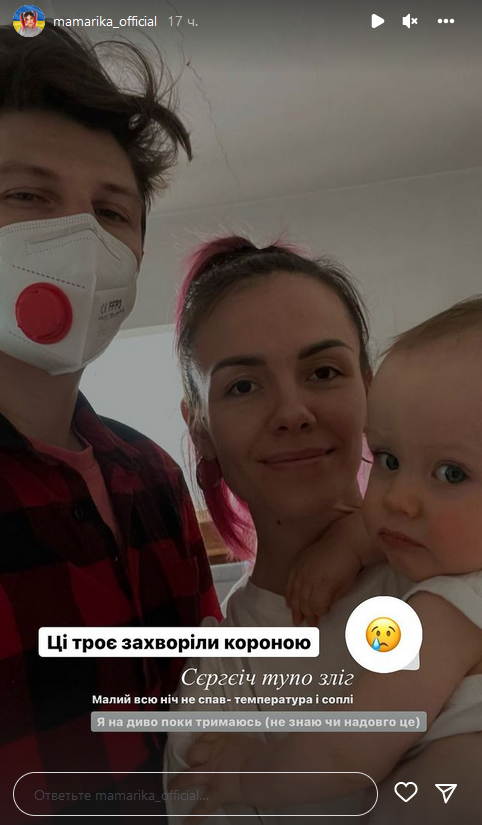 "У нас недобрі новини. Ці троє захворіли короною. Сєргєіч тупо зліг. Малий всю ніч не спав - температура і соплі. Я на диво поки тримаюсь (не знаю, чи надовго це)", - написала співачка.