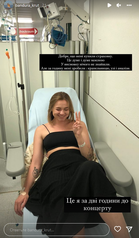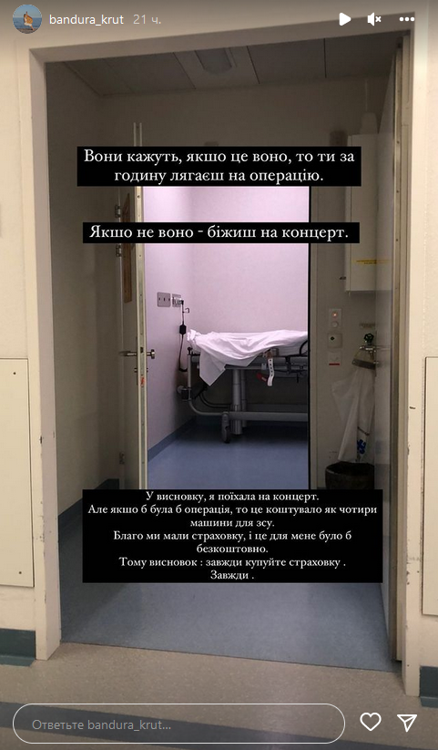 "У висновку, я поїхала на концерт. Але якби була операція, то це коштувало б як чотири машини для ЗСУ. Благо ми мали страховку, і це для мене було б безкоштовно. Тому висновок: завжди купуйте страховку. Завжди", - наголосила Круть.