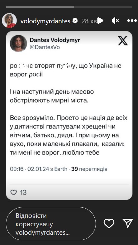"Росіянє вторят Путіну, що Україна не ворог Росії. І на наступний день масово обстрілюють мирні міста. Все зрозуміло. Просто це нація, де всіх у дитинстві ґвалтували хрещені чи вітчим, батько, дядя, і при цьому на вухо, поки маленькі плакали, казали: "Ти мені не ворог. Я люблю тебе", - прокоментував тероризм РФ проти України співак.