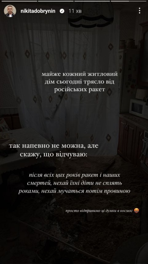 Ведучий та колишній чоловік блогерки Даші Квіткової також вийшов на зв'язок у соцмережах. "Майже кожний житловий дім сьогодні трясло від російських ракет… так, напевно, не можна, але скажу, що відчуваю: після всіх цих років ракет, наших смертей нехай їхні діти не сплять роками, нехай мучаться потім провиною. Просто відправимо ці думки в космос", - висловився чоловік про злочини росіян.