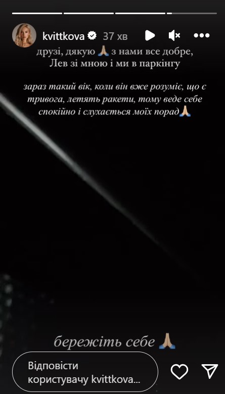 "Друзі, дякую, з нами все добре. Лев зі мною, і ми на паркінгу. Зараз у нього такий вік, коли він уже все розуміє: що є тривога, летять ракети, тому веде себе спокійно і слухається моїх порад. Бережіть себе", - написала зірка соцмереж про себе та свого 2-річного сина Лева.