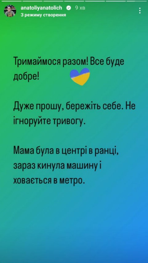 Ведучий та шоумен вийшов на зв'язок в Instagram та закликав українців не падати духом, берегти себе. "Тримаймося разом! Все буде добре. Дуже прошу, бережіть себе, не ігноруйте тривогу. Мама була в центрі вранці. Зараз кинула машину і ховається в метро", - написав чоловік про атаку.