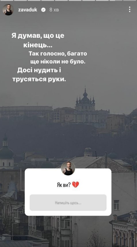"Я думав, що це кінець. Так голосно і багато ще ніколи не було. Досі нудить і трусяться руки", - зазначив продюсер в Instagram-stories.