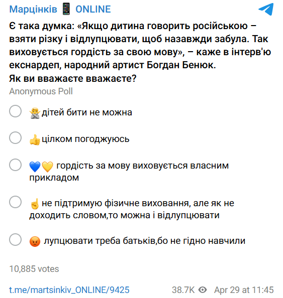 "Є така думка: "Якщо дитина говорить російською – взяти різку і відлупцювати, щоб назавжди забула. Так виховується гордість за свою мову", – каже в інтерв'ю екснардеп, народний артист Богдан Бенюк", - наводить цитату Марцінків. У опитуванні він питає, чи погоджуються з ним підписники.