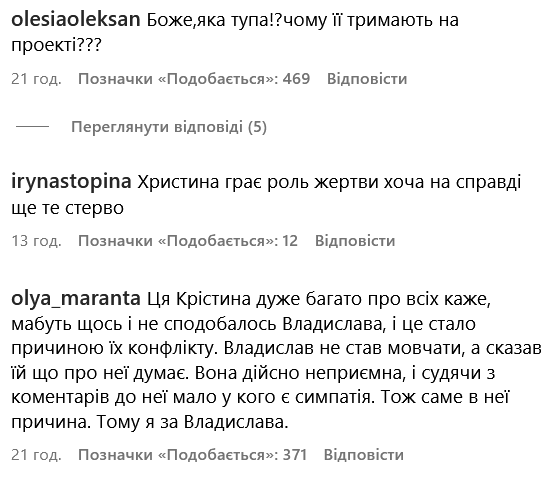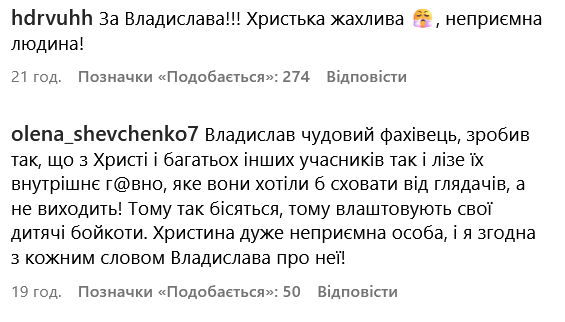 За словами іншої учасниці, Владиславу на проєкті "оголосили бойкот". Фрагмент епізоду зі скандалом опублікували на Instagram-сторінці "МастерШеф", куди одразу побігли шанувальники шоу для обговорення конфліктної ситуації. Більшість коментаторів стала на бік психолога.