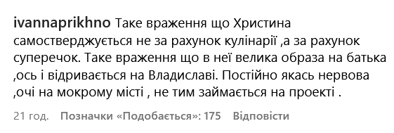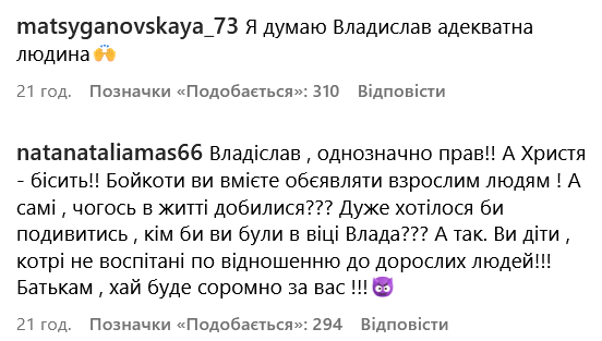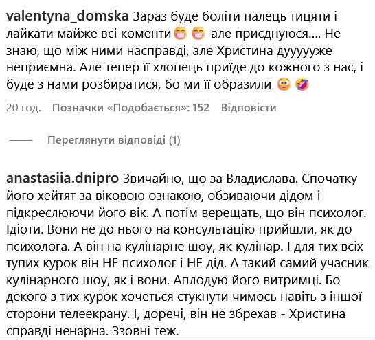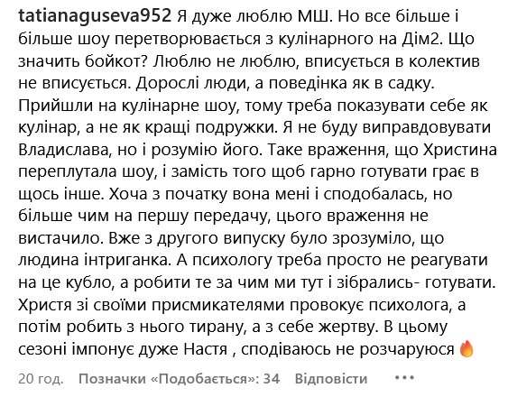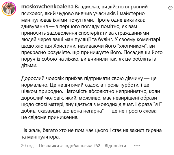 Також у коментарі прийшла суперфіналістка 13 сезону шоу "МастерШеф" Олена Московченко, яка засудила захисників Владислава, назвавши психолога "маніпулятором" і "тираном".