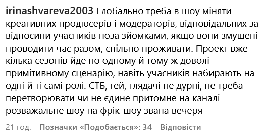 Решта користувачів мережі розкритикувала шоу "МастерШеф-14", а його творців звинуватили в тому, що кулінарний проєкт перетворився на "фрік-шоу "Звана вечеря" або російський "Дім-2".