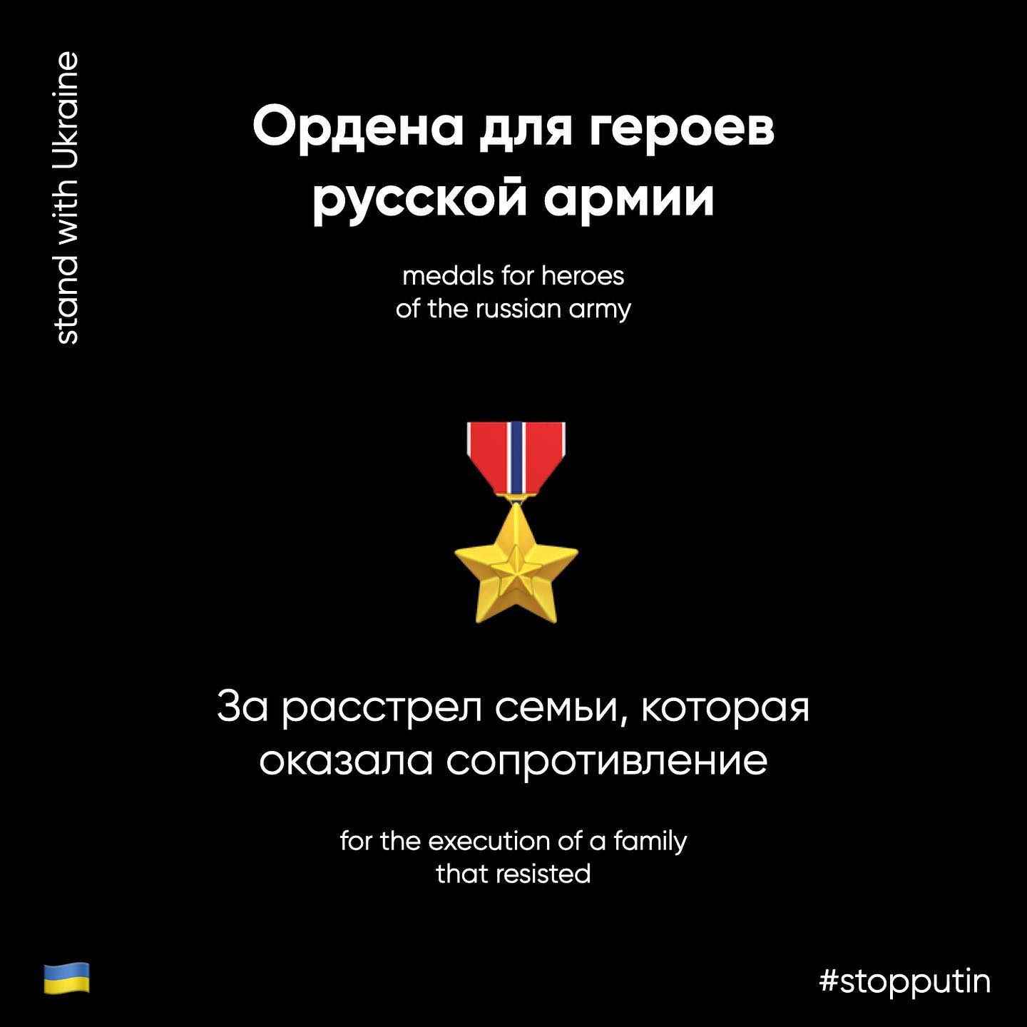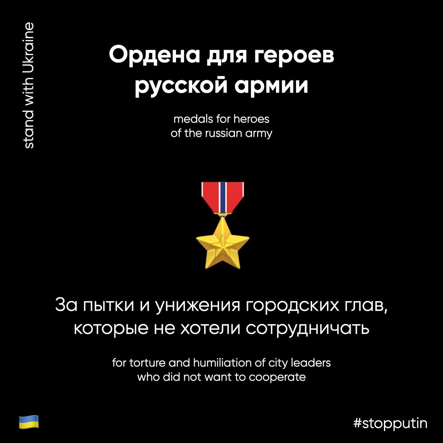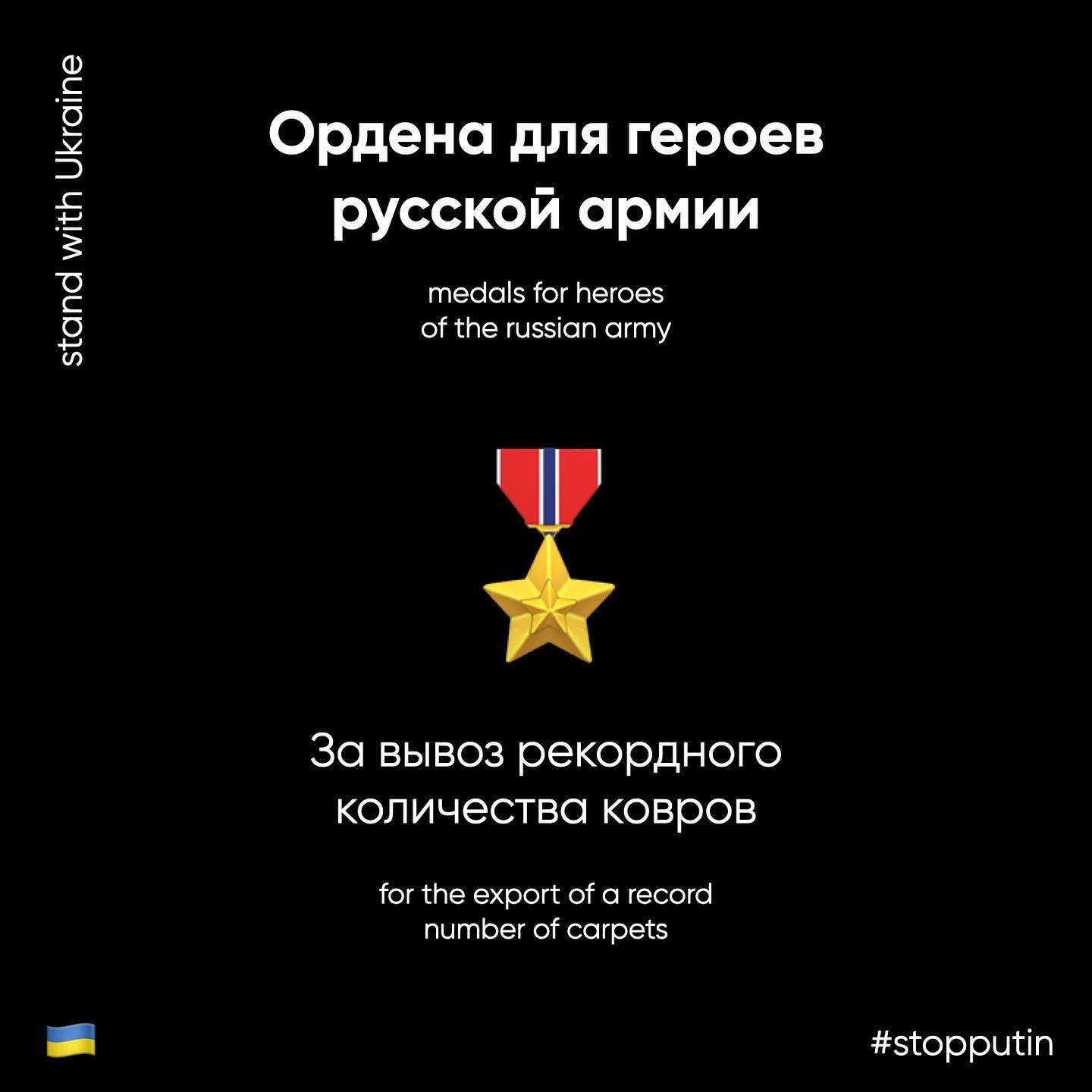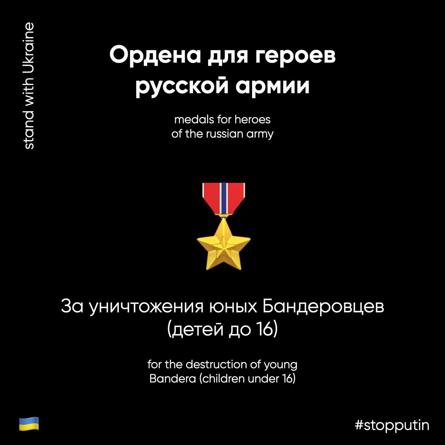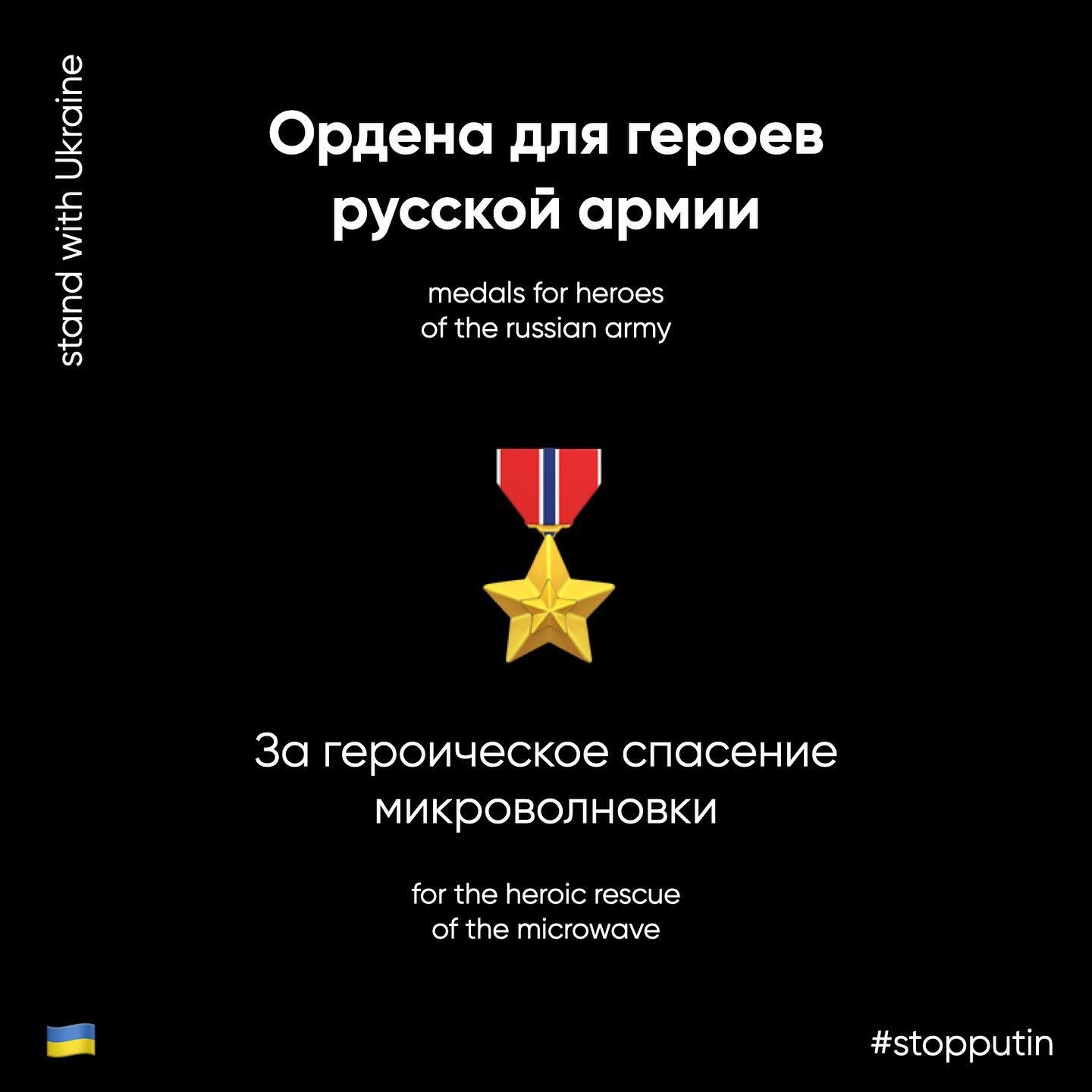 Військові злочини російських окупантів викликають жах і ненависть українців, а фейки ворожої пропаганди про "героїзм" їхньої армії - глузування та зневагу. Український блогер та підприємець Євген Таллер придумав для солдатів РФ гідні нагороди та опублікував у Instagram відповідні зображення.