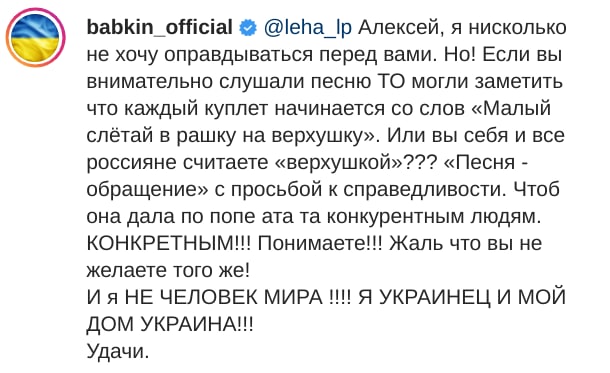 На що Бабкін дав змістовну відповідь: "Олексію, я анітрохи не хочу виправдовуватися перед вами. Але! Якщо ви уважно слухали пісню, то могли помітити, що кожен куплет починається зі слів: "Малий, злітай у рішку на верхівку". Чи всі росіяни себе вважають "верхівкою"? Пісня – звернення з проханням до справедливості, щоб вона дала по п*пі конкретним людям. Конкретним, розумієте? Жаль, що ви не бажаєте того ж. І я не людина світу. Я – українець, мій дім – Україна!".