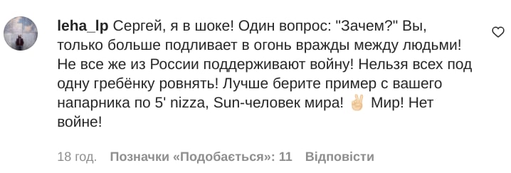 "Сергій, я шоці! Одне питання: "Навіщо?". Ви тільки більше підливаєте у вогонь ворожнечі між людьми! Не всі ж у Росії підтримують війну! Не можна всіх під один гребінець рівняти! Краще беріть приклад з вашого напарника по 5'Nizza, Sun - людина світу!" - написав росіянин у коментарях в Instagram.