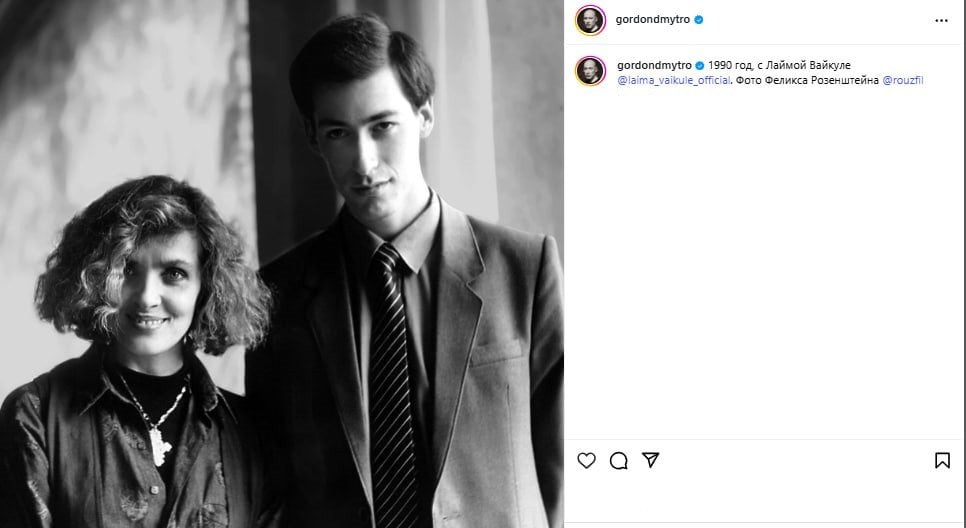 "1990 рік, з Лаймою Вайкуле", - лаконічно прокоментував світлину Гордон.