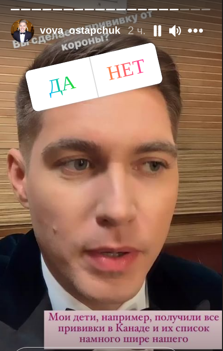 "Якщо ця вакцина сертифікована США, Великобританією або ЄС, значить вона перевірена і я з задоволенням, щоб ще раз не захворіти, зробив би собі щеплення. Тим більше у мене діти отримали всі щеплення, а Еван отримав в Канаді на 3-4 щеплення більше, ніж у нас в Україні. Але ніякого Супутника", - відповів ведучий, заздалегідь відмовившись від російської вакцини від Covid-19.