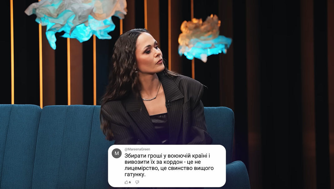 "Збирати гроші у воюючій країні та вивозити їх за кордон - це не лицемірство. Це свинство вищого ґатунку", - зачитав ведучий коментар користувачки соцмережі на ім'я Марина.