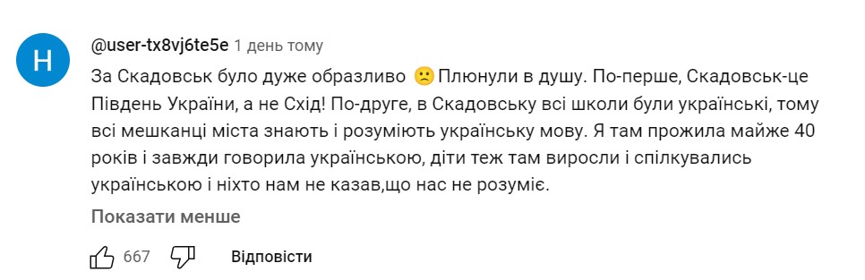 "Якби смішний каламбур вийшов із назви якогось іншого українського міста, в якому люди більше розмовляли російською, була б назва цього міста. Можливо, справді, у цій ситуації недоречно було для жартів обирати саме Скадовськ, - написав він у Instagram. - Але цей номер не про "сіські" і не про Скадовськ. Цей номер про людей, які у повсякденному спілкуванні не наважуються говорити українською, боячись того, що говорячи з помилками, вони якось не так виглядатимуть в очах інших людей. Тому головний меседж цього номера в тому, що помилятися не соромно".