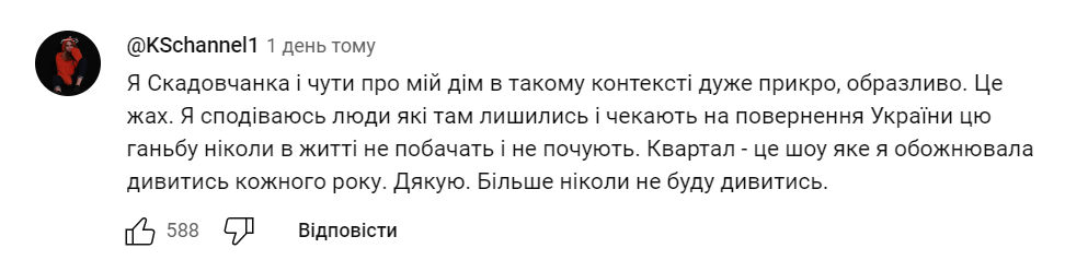 Такий гумор обурив та образив багатьох українців, включно із мешканцями самого Скадовська. Звернувся до "кварталівців" також і міський голова Скадовської ОТГ Олександр Яковлєв.
