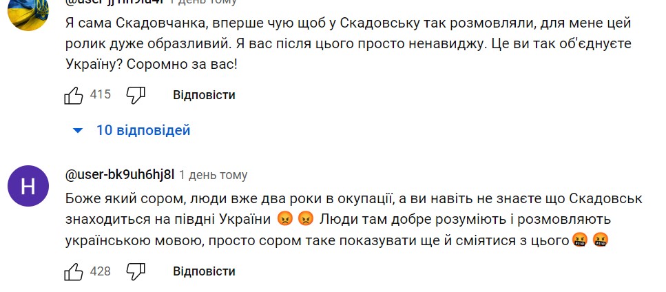 Чому в такому разі коміки обрали саме форму висміювання помилок, Юрій Великий не пояснив. Відповідальність за те, що скадовчан образили їхні жарти, він завуальовано переклав на жителів міста.
